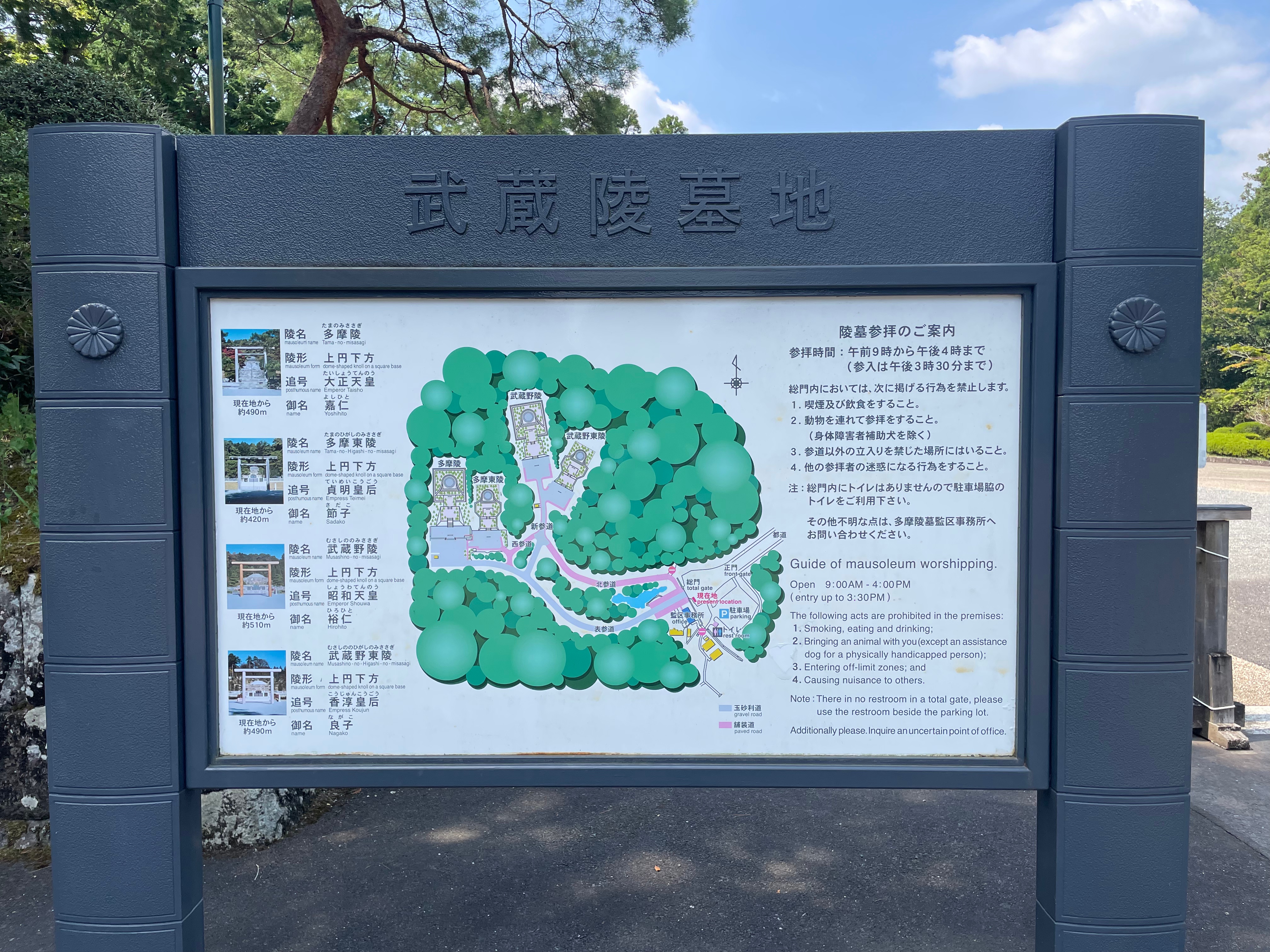 多摩陵(大正天皇御陵)、多摩東陵(貞明皇后御陵)、武蔵野陵(昭和天皇御陵)、 武蔵野東陵(香淳皇后御陵)